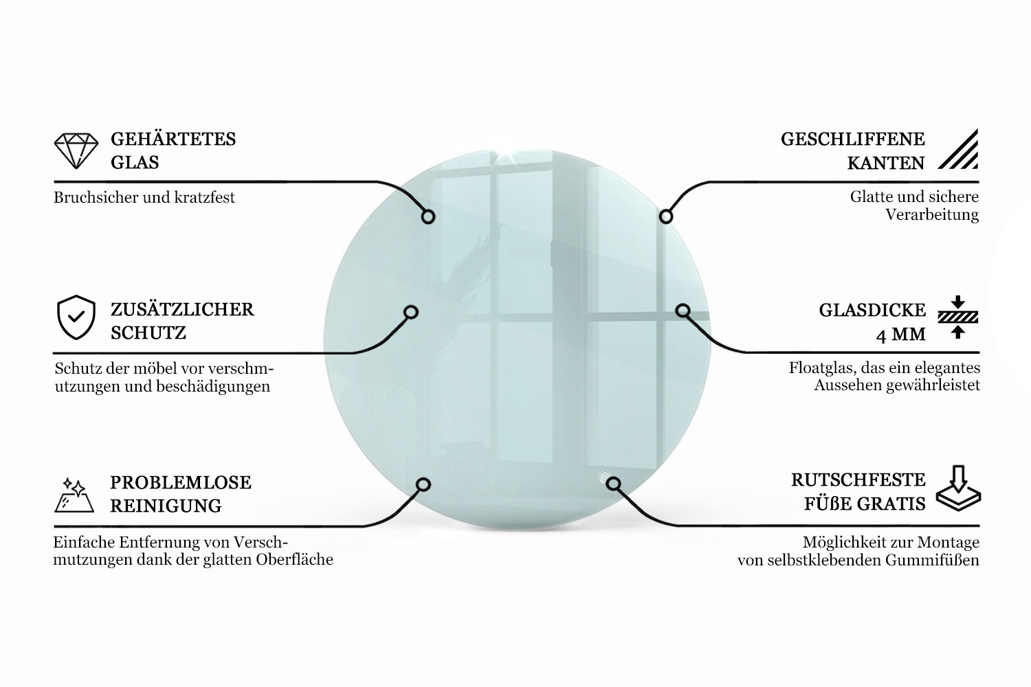 Die Tischplatte rund transparent verleiht Ihrem Tisch und Ihrem Wohnraum eine moderne, elegante und leichte Ausstrahlung. Die transparente, runde Form aus gehärtetem Glas fügt sich harmonisch in jede Einrichtungsrichtung ein – von modernen und skandinavischen Räumen über klassische Interieurs bis hin zu Loft- oder Minimalismus-Stilen.